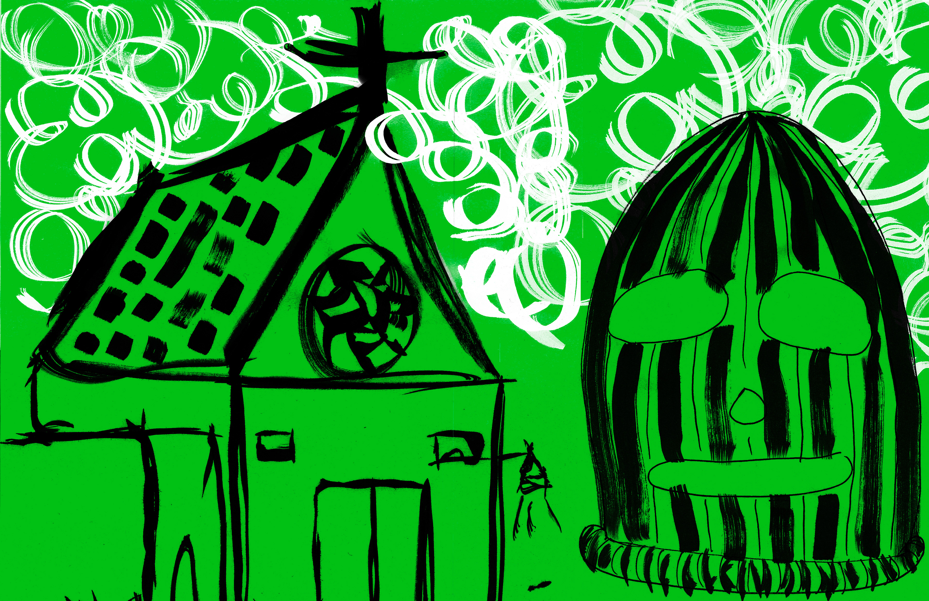 Techniques used include: spray paint, linoleum prints, ink, micron pens, and bubblewrap. The final physical copy is 4.5" x 3.5" bound by thread with a silver cross charm.